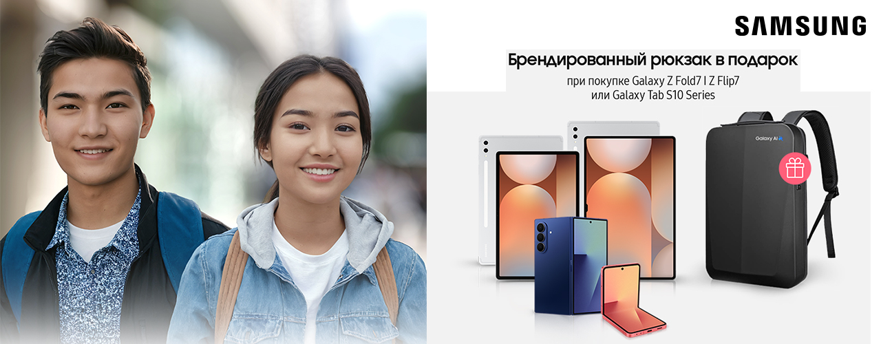 При покупке Galaxy Z Fold7 | Flip7 или Galaxy Tab S10 series вас ждёт брендированный рюкзак Samsung в подарок.